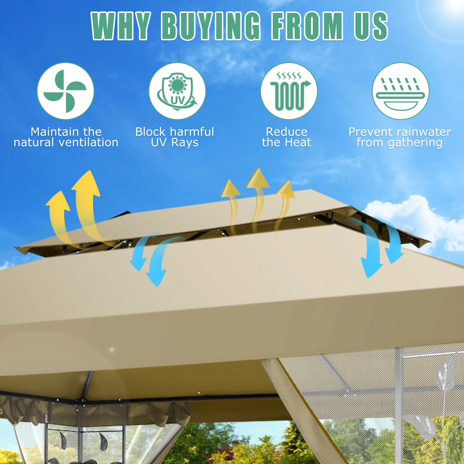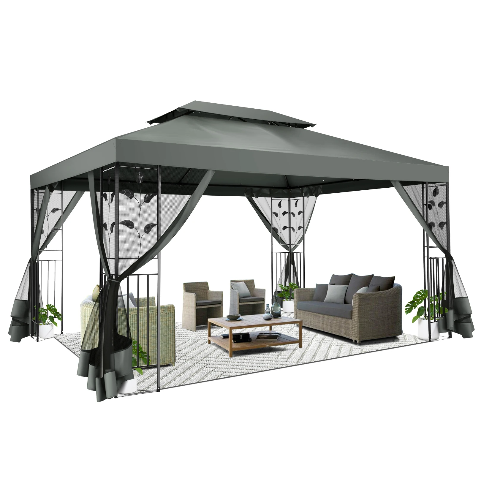 🏆【Smooth-Sliding & Bug-Free Netting with Zipper】This gazebo tent is equipped with a mosquito netting screen that has two-sided zippers, allowing for proper ventilation while keeping pests out and enabling smooth sliding to open and close. And this garden gazebo comes with hook-and-loop fasteners, making it quick and easy to hang the screens.