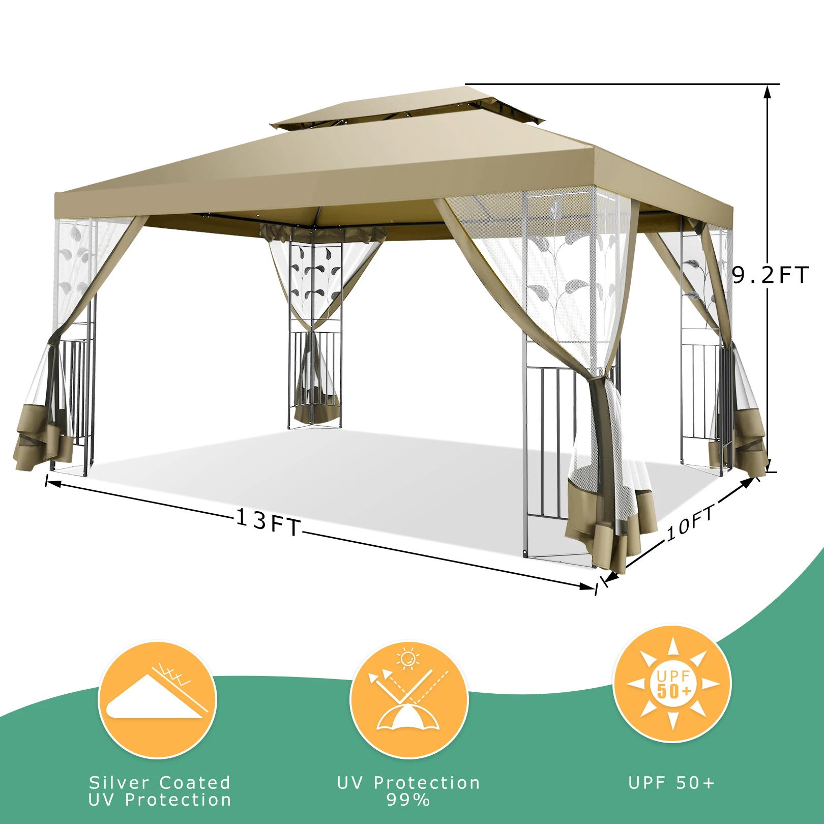🏆【Suitable Space & Multi-Scenario for All Family】Even for smaller houses, this deck gazebo measures 13' L x 10' W x 9' H, providing ample space for 4-6 people. Ideal for outdoor activities such as family gatherings, parties, sunbathing and daily relaxation, this canopy gazebo is the perfect addition to your patio, backyard, or garden.
