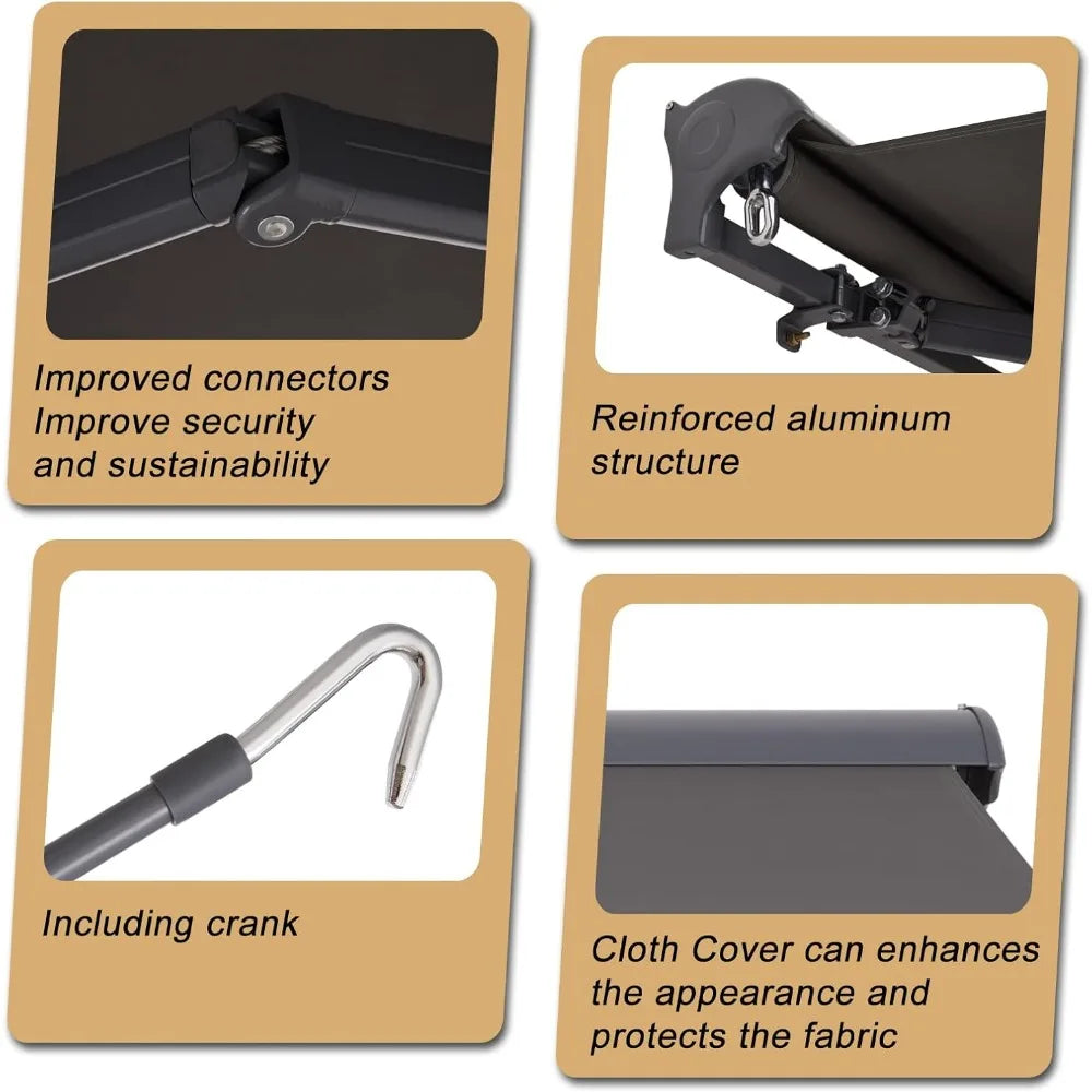 - 【Industrial Length Frame】 Patio awning come with 1.5mm galvanized steel beams (vs. 1.1mm competitors)+16 gauge crossbars support 65lbs/qq. and 300D Oxford fabric withstand 55mph winds (tested in certified lab). Manual crank (0°~45° tilt) with 8ft projection range.