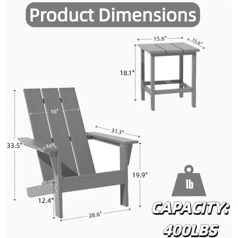 【ERGONOMIC EXCELLENCE】: Adirondack Chair Designed for universal comfort with a 130° reclining angle (scientifically optimized for lumbar support) and spacious 31"D x 29"W seating area. Accommodates adults of all sizes – from tall individuals to plus-size users – without compromising comfort.Adirondack Chair can bear a weight of 400 pounds, you no longer need to worry about it breaking like other materials