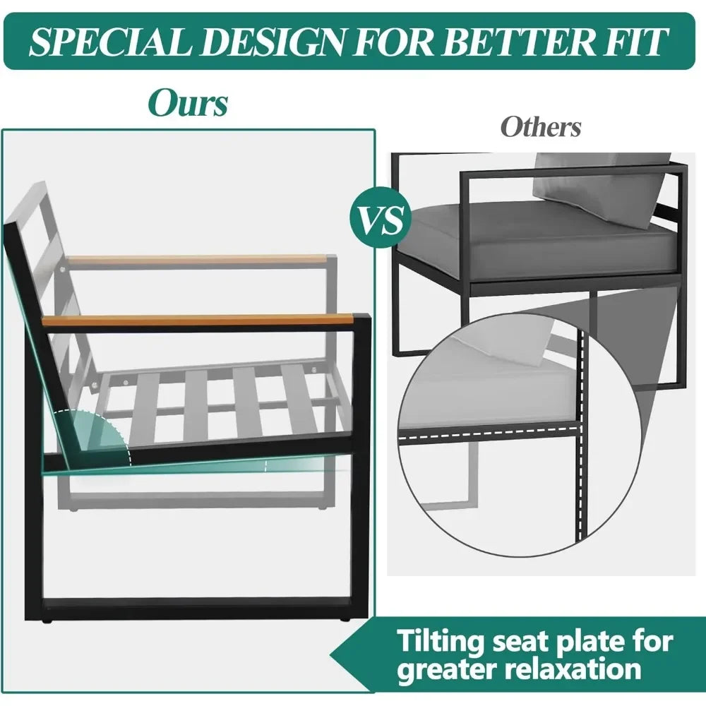 - ️CONSIDERATE DESIGN & OPTIONAL PLACE CONBINATIONS: The 4-piece patio furniture set equipped with comfortable cushions. Ergonomically and tilting seat design provide ample support for your back and hips, allowing for extended conversations and enjoy the comfort of sitting down. And our clear instructions guide you through each step with all necessary accessories to the aluminum frame furniture set. No matter which scene you place the furniture sofa set in what kind of arrangement, it is a style that you can choose for yourself