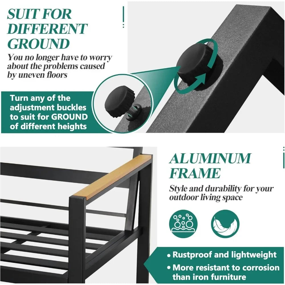 - ️EXCELLENT WEIGHT CAPACITY: Our furniture set includes two armchairs, one loveseat with wood armrest, and a coffee table. The aluminum conversation sofa set features loveseat that can withstand up to 600 lbs and armchair that can hold 352 lbs, the coffee table can hold up to 88lbs. The furniture set can be adapted to all kinds of floors, as our feetpads not only keep it stable but also protect the floor from scratches