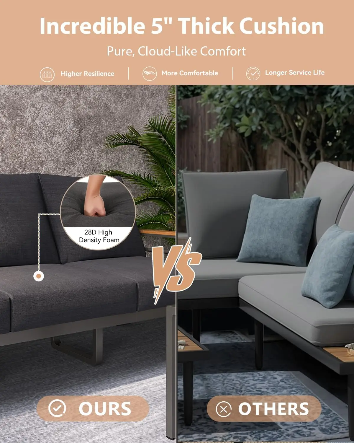 - 【Perfect for Any Outdoor Occasion – Rain or Shine】Host summer BBQs effortlessly: Quick-dry cushions handle spills, the heat-deflecting wood-aluminum combo stays cool even in direct sunlight, and modular seating adapts to your space. Use as a complete conversation set or separate pieces around fire pits, gardens, or sunrooms.