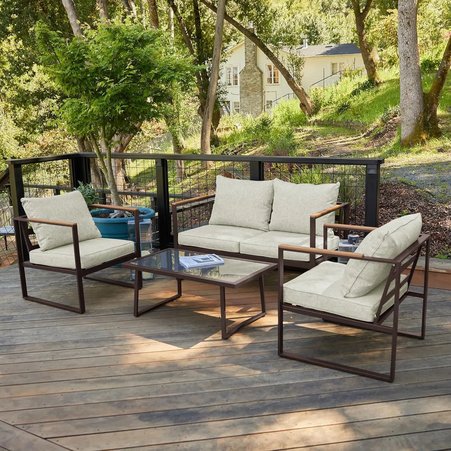 patio furniture set, 4-piece outdoor patio set with sofa, removable & washable deep seating cushion, tempered glass table, outs